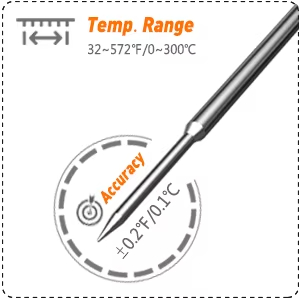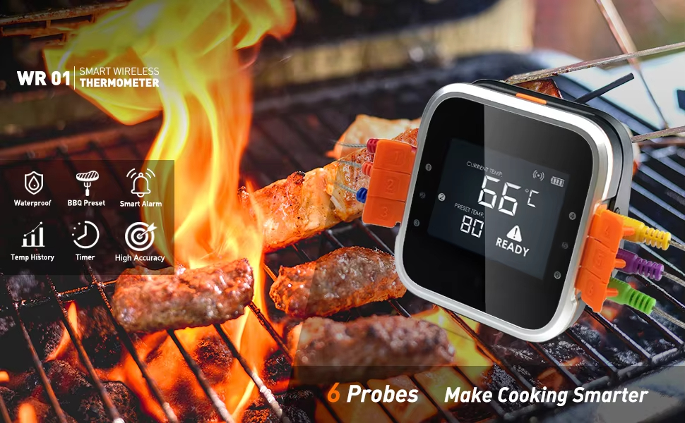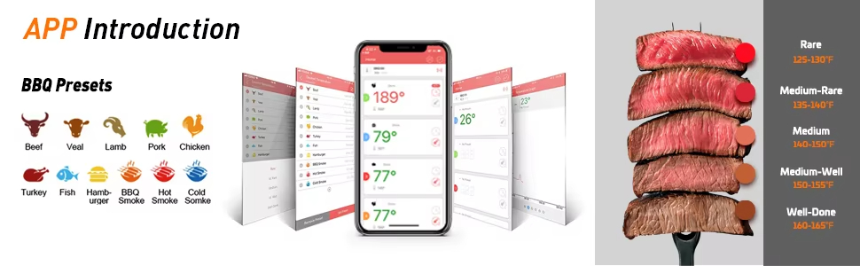 ✔️【HANDS FREE ACCURATE MONITOR】Wireless meat thermometer with 6 stainless-steel probes monitors, monitor distance is up to 100ft indoors / 170ft outdoors,accurate to ±1.8°F ( ±0.1℃), would range to 32°F to 572°F (0°C to 300°C). Digital food thermometer package with 6 Durable and Accurate Probes, best for grilling, smoking, cooking.