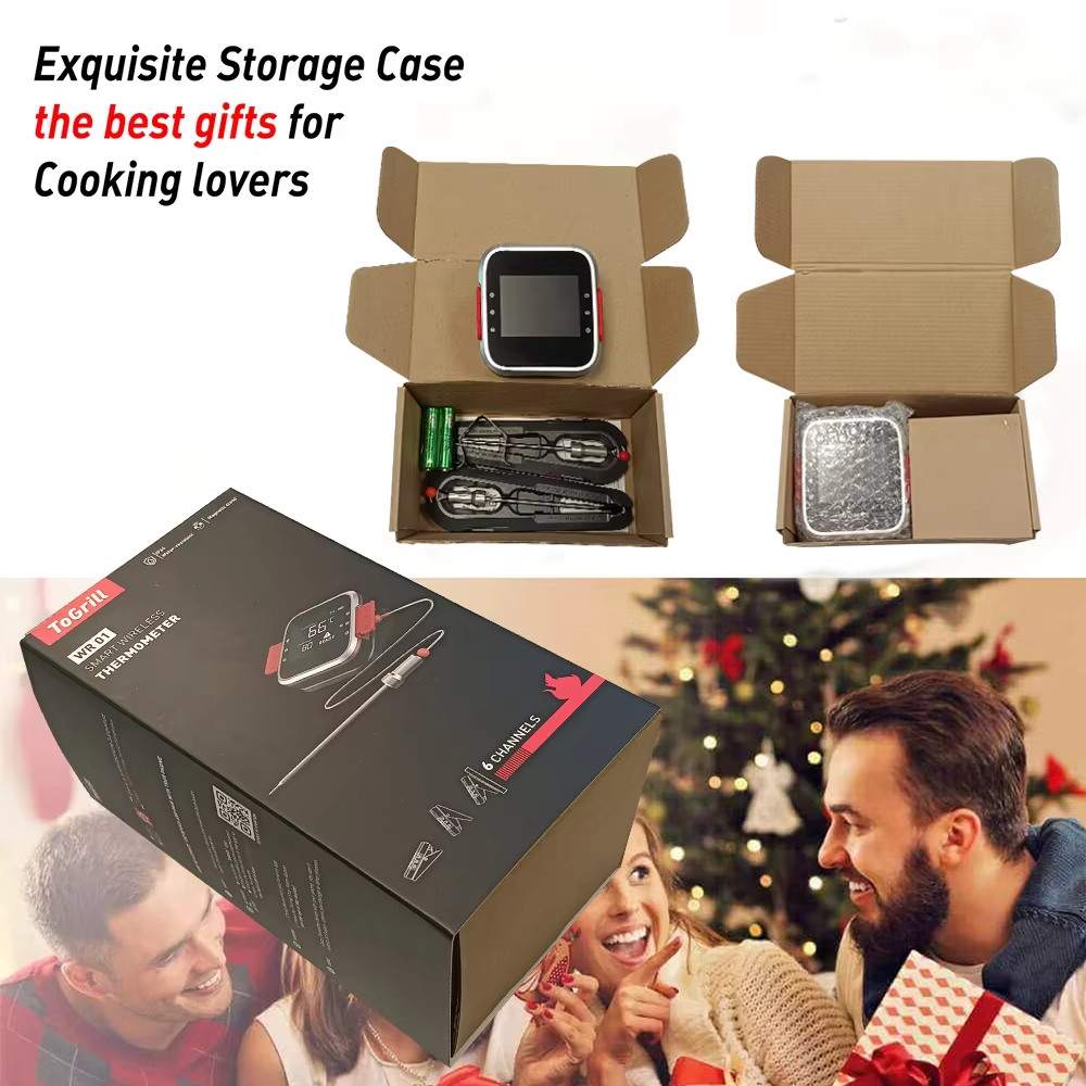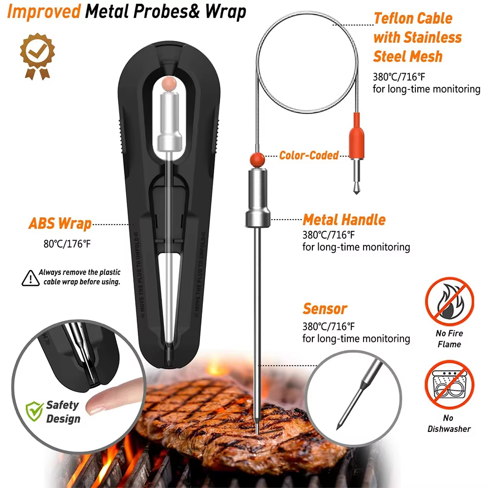 ✔️【EASY STORAGE & CLEAN】Customize storage bag and probe stand, nerver worry about orderless kitchen thermometer and probes after using. IP65 waterproof is easy to clean the wifi bbq thermometer. Best gift for food making lovers.