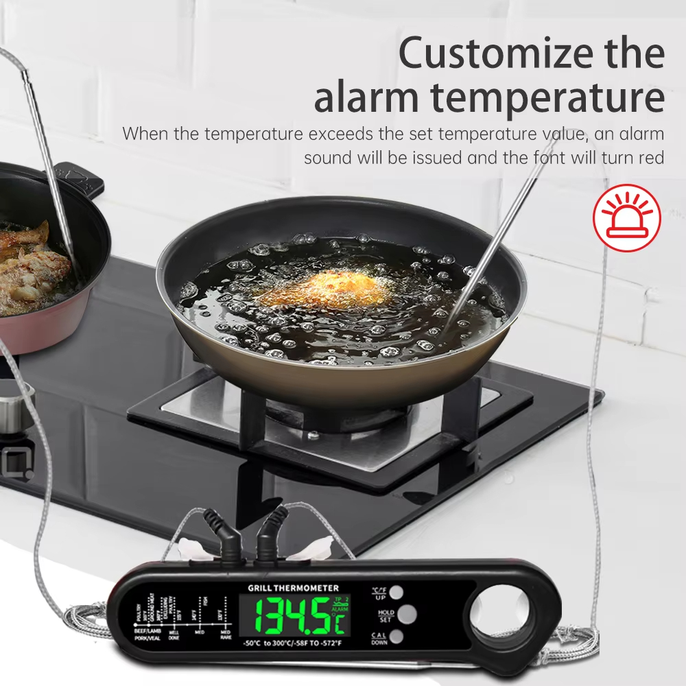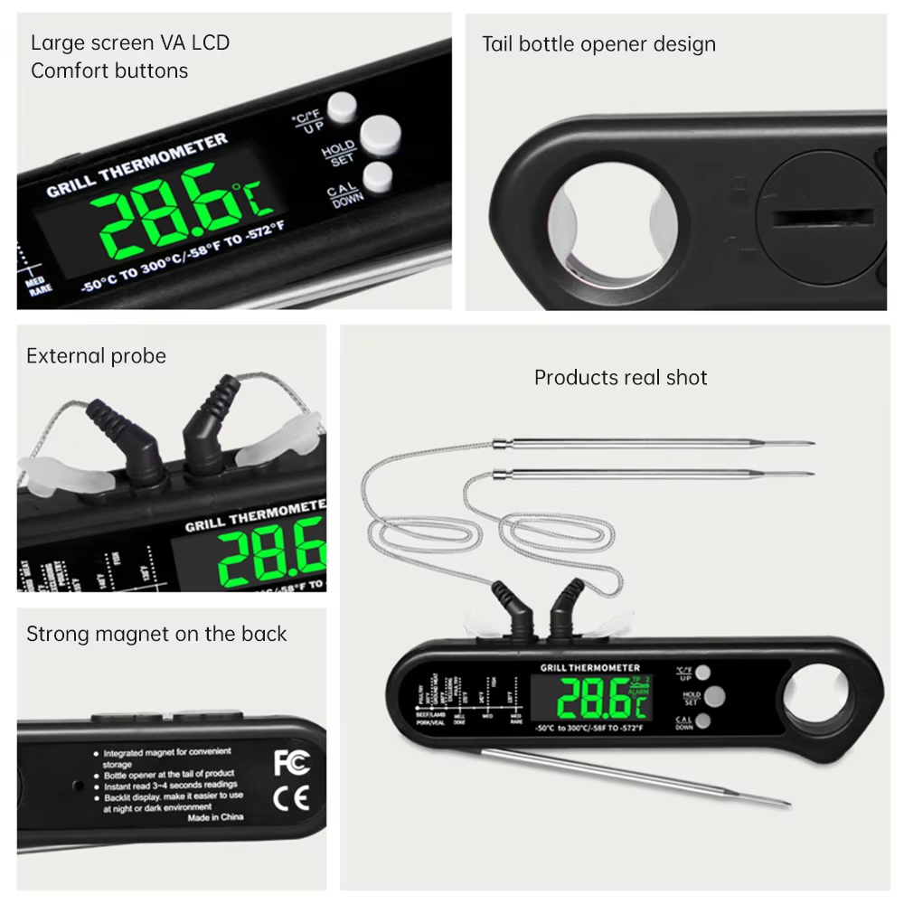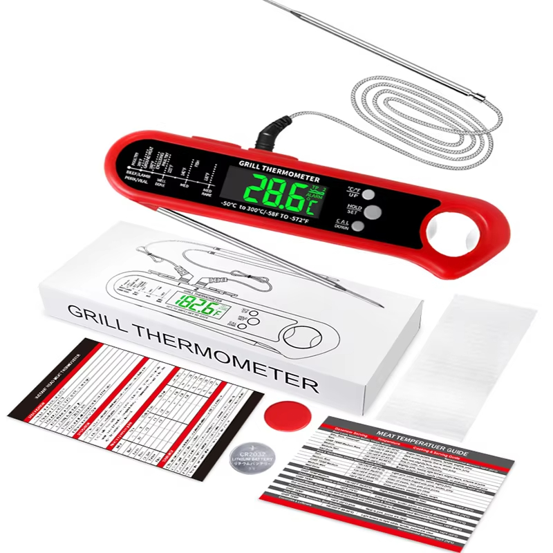 1. Measuring range: 0-300°C 2. Temperature resolution: 1°C 3. Temperature error: ±1°C 4. Single product size: 16x3.5x2cm 5. Single product packaging size: 17x7x2.5cm 6. Weight of a single product package: 150G 7. Packing quantity: 96PCS/Carton 8. Carton Size: 41*36*34CM,weight:15kg/carton 9.Material:ABS+stainless Steel |