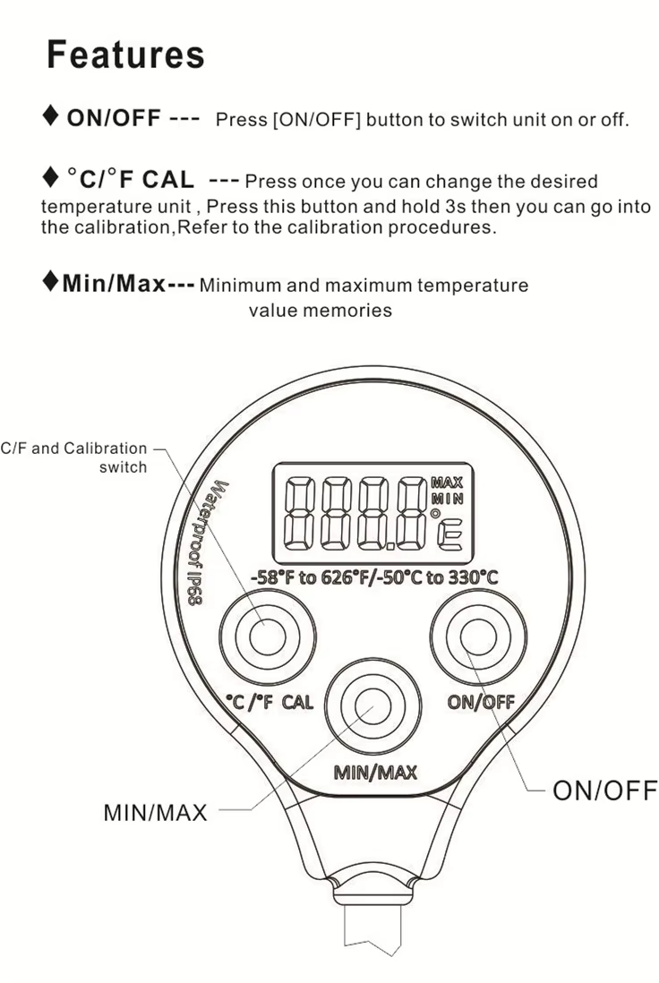 Measuring Range:-58°F to 626°F/-50°C to 330°C